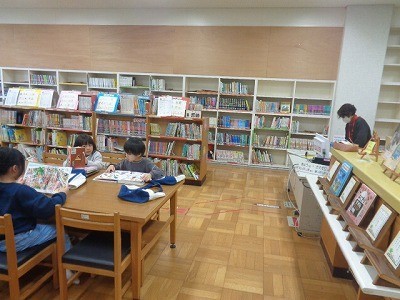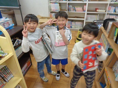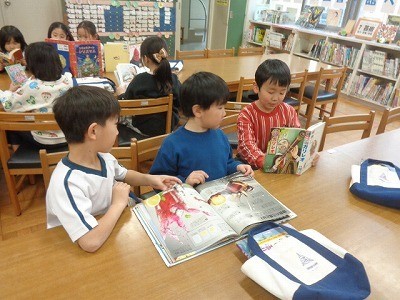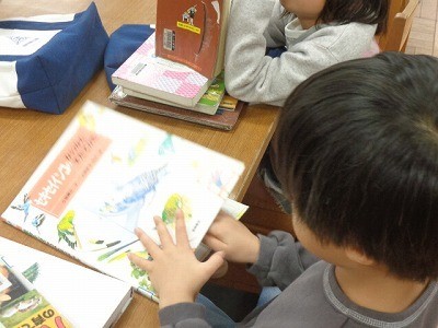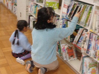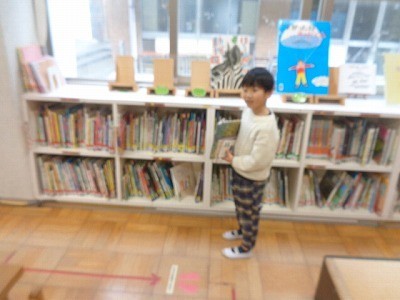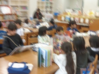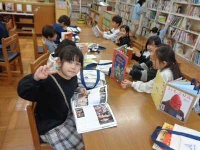 図書館で本を借りています。図書館支援さんも来校しているため、本の紹介をしてもらいました。