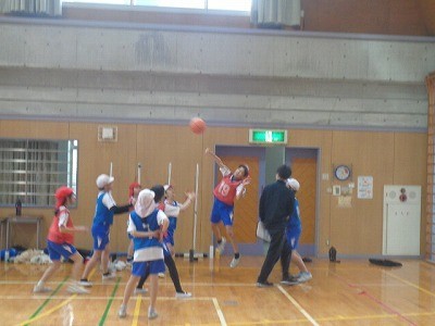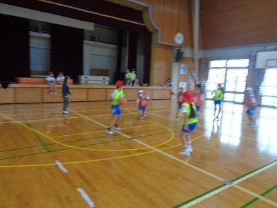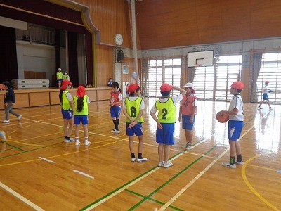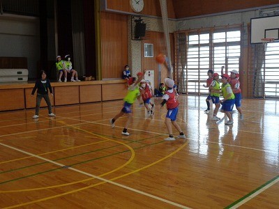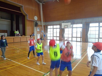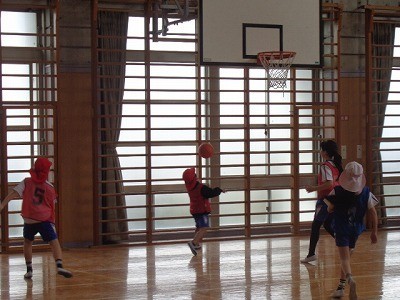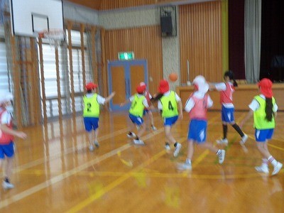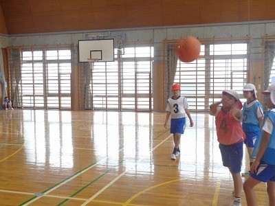 チームを作って、バスケットボールを行っています。ボールを一生懸命つないでいき、シュートを決めていました。