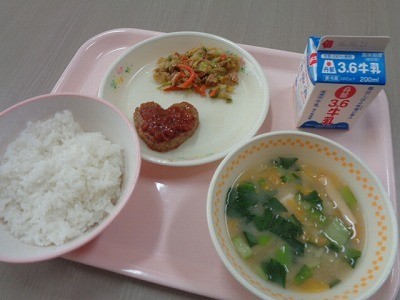 明日はバレンタインデーです。そのため、給食室からは、ハート型のハンバーグが届きました。トマトソースもかかって、赤色のハートです。