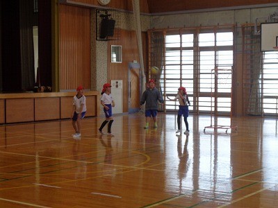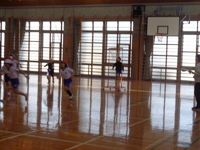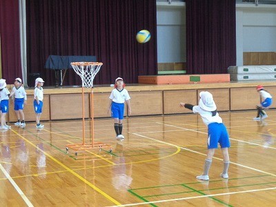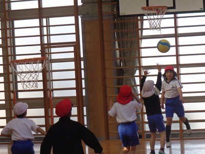 セストボールを行っています。バスケットボールを小学校でも行いやすくしたスポーツです。みんなでボールをつないでシュートを決めていました。
