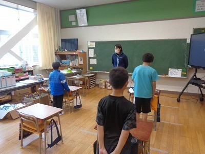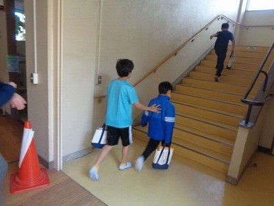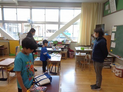 あいさつをして、図書館へいくところです。電気係は、しっかりと電気を消していました。
