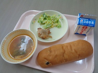 2月6日から22日まで、イタリアでオリンピックが開かれています。そこで、イタリアにちなんでのメニューです。主食は、干しぶどうパン。イタリアはぶどう酒の産地で有名で、干しぶどうから作るワインもあります。クリスマスに欠かせない、パネトーネというパンには必ず干しぶどうを入れます。また、ミネストローネは、具だくさんの野菜スープで、イタリアの代表的な家庭料理です。豆、パスタ、米、野菜などを煮込んだものです。