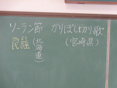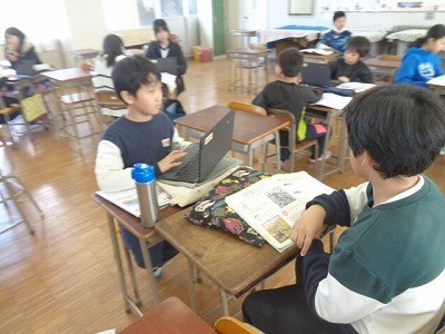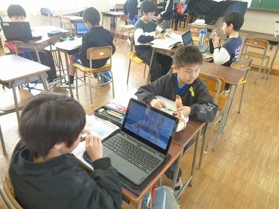 ソーラン節やかりぼし切り歌などの民謡を、クロームブックを使って鑑賞しています。グループになって活動していました。