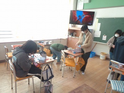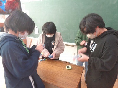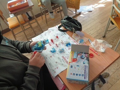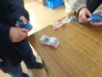 手回し発電機をつかって、発電し、自分の車を動かしています。より速く、より遠くへ車を動かすためには、どうしたらいいか、考えています。