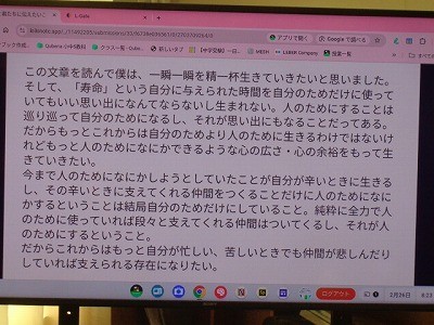 「きみたちにつたえたいこと」という文章を読んで、感じたことを伝え合っています。