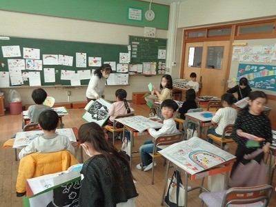 1年生で創った作品を整理して、作品バックに入れています。たくさんの作品をつくりましたね。