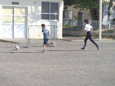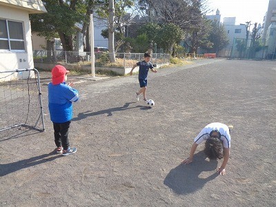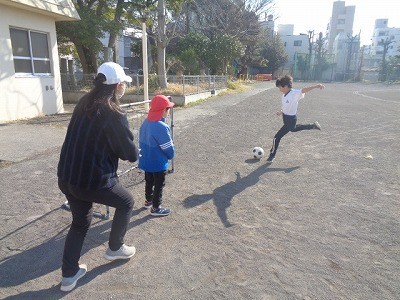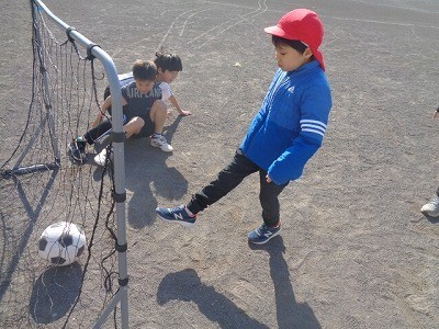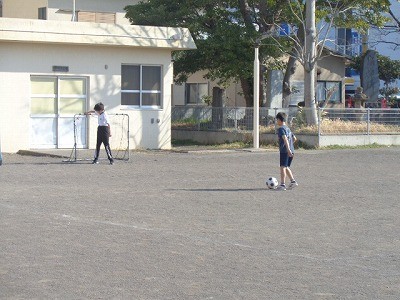 サッカーをおこなっています。シュートが決まりました。