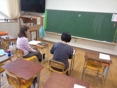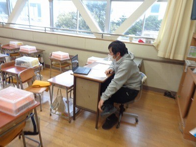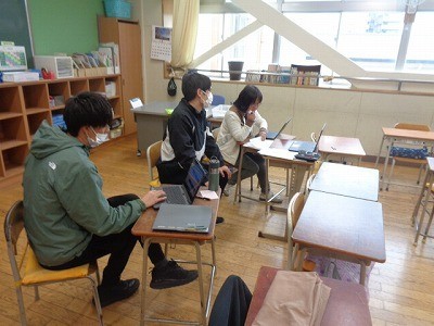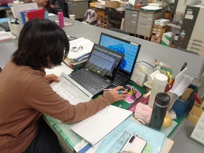放課後、第一小、第二小、千本小の三校の先生たちがオンライン会議をおこなって、来年度の統合に備えました。