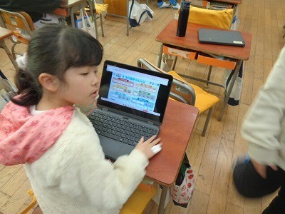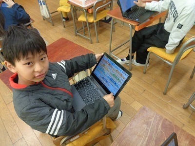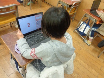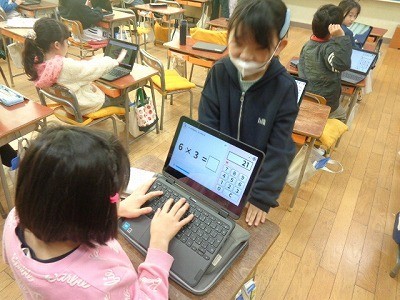 クロームブックを使って、九九の勉強をしています。