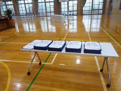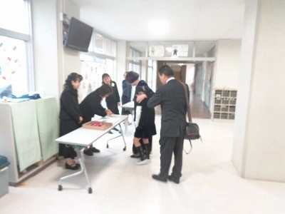 受付のようすです。雨は降っていますが、みんな晴れやかな顔で登校しています。