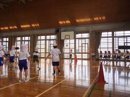 4年生の体育では、ベースボール型ゲームを行っています。ドッジボールラリーの練習として、ボールを直球でしっかりと投げたり捕球したりする練習を始めました。ベースボール型では、「みんなでアウト」ゲームを行い、バットの代わりにボールをおもいっきり手で打ち、守備全員が集まり「アウト!!」と叫ぶまでにどこまで走塁できるか挑戦しました。汗だくで走り回りながら、ベースボール型ゲームを楽しみました。