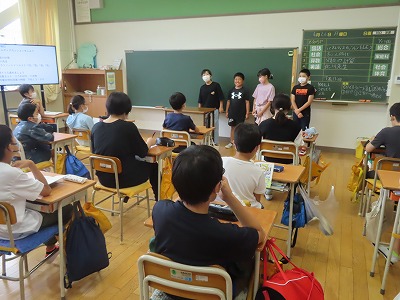 5年生の黒板に、「自然教室おかえりなさい」のメッセージが…。