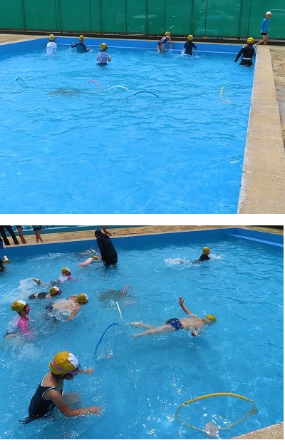 1ねんせいは3じかんめに、はじめてのプールをおこないました。みずのなかにあるわをくぐっています。