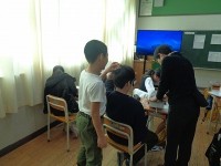 「学校に通うメリット」について、今まで調べたことを発表しています。役割分担をしながら、発表内容をみんなで考えていました。