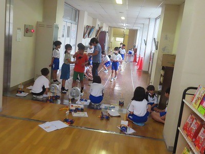 風の力で、どれくらい動くのか、また、風の力を強くするとどうなるかなど、実際に車を動かして調べています。