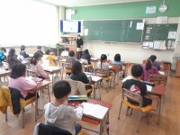朝の会で、「お楽しみ会」を行う準備のための説明を聞いています。わからないところを質問していました。