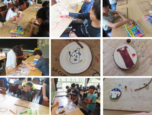 午後3時からは、食堂で「クラフト体験(キーホルダーづくり)」を行いました。しらかばの木に絵を描いて、キーホルダーにしました。よいおみやげができました。