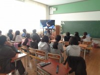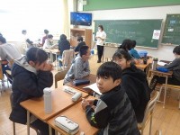 数の答え方について、英語で伝えています。動画をみながら、出てきたイチゴなどの果物がいくつか、答えていました。