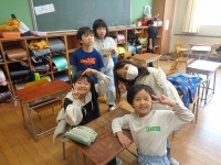 休み時間です。そうじがおわって、ほっとひといきついています。