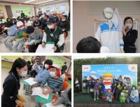 ランチョンマットを作っています。 地域のボランティアさんも、協力してくださって...