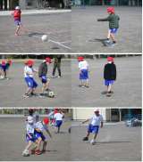 5年生の体育の時間です。サッカーを行っています。キック、パスの練習を行い、最後...