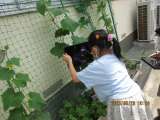野菜の苗がぐんぐん伸びて,部屋から見るとグリーンカーテンになってきました。朝顔...