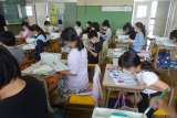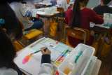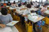 5年図工「心のもよう」の様子です。筆あとを残す、にじませる、かすれさせる、とばす等の技法を選んで表現していきました。