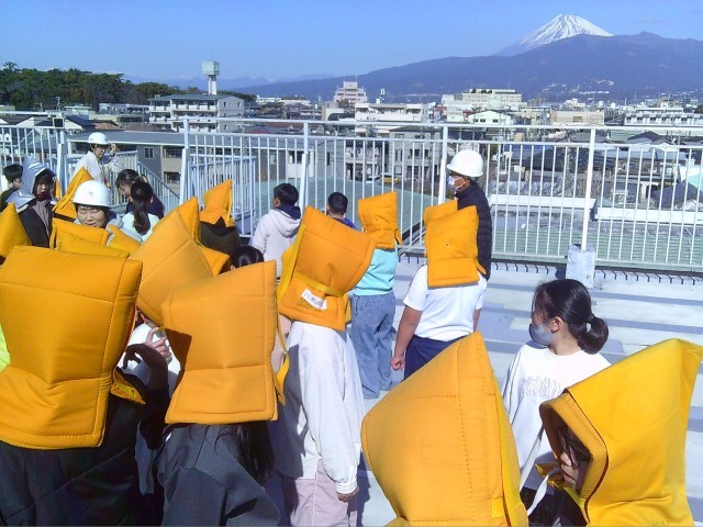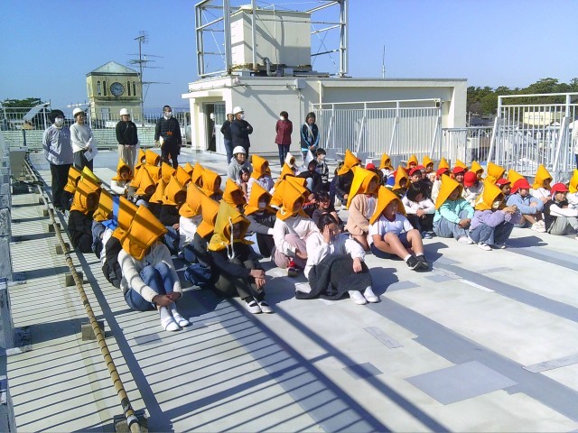 休み時間に地震が発生したという想定の避難訓練を抜き打ちで実施しました。子供たちは日頃の訓練を生かしてとっさに身を守る行動を取り、速やかに屋上に避難することができました。