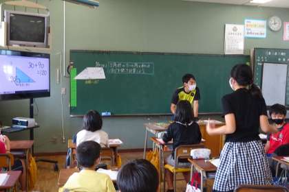 5年算数「図形の角」の様子です。「三角形の3つの角の和は180度」という既習事項を使って計算問題に挑戦していました。