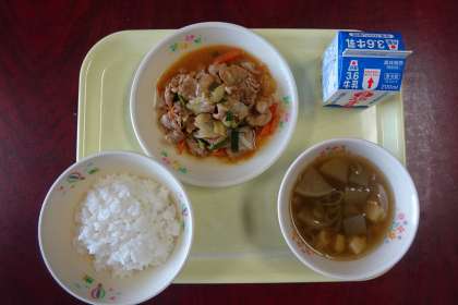 本日の献立は、「スタミナ焼き肉 けんちん汁 自校米飯 牛乳」でした。