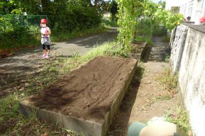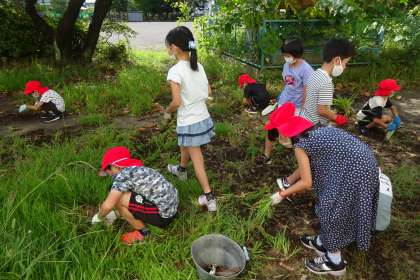花壇の周りの草取りも行い、土作りが完了しました。Chromebookを使って種メーカーの野菜作りのサイトを見て、どの野菜が2年生でもできるかを調べた結果、「ほうれん草」と「葉ねぎ」に決まったようです。