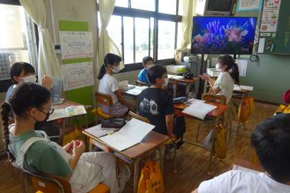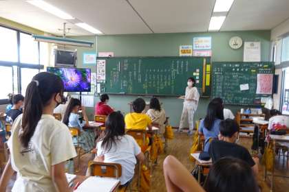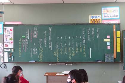 6年国語の様子です。「日本語レッスン」の学習で、文末の表現、敬体などを学んでいます。常体の文末を敬体にするとどうなるかを、隣どうしで話し合い、全体で発表し合いました。