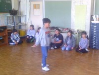 3年英語の様子です。ハンバーガーショップの店員とお客さんに役割分担をし、「May I help you ? 」「Yes ○○,please.」 などのやりとりをしました。