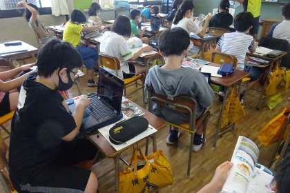 5年社会「私たちの生活と食料生産」の様子です。水産加工品について学習していました。産地名として、「長崎県」があがり、「長崎県はどこにあると言い表したらいいか。」という教師の質問に、長崎県がどこにあったか確認してみようと、地図帳ゆChromebookで調べ始めました。
