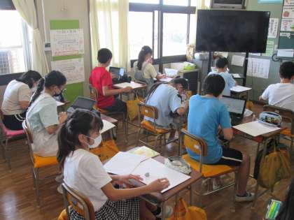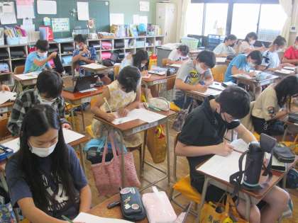 「ローマ字,アルファベットの活用」というテーマで,画用紙の余白やバランスのよい文字の配置に気をつけながら清書をしていました。