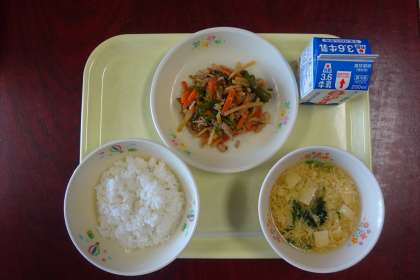 本日の献立は、「チンジャオロース たまごとコーンのスープ 自校米飯 牛乳」でした。