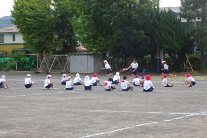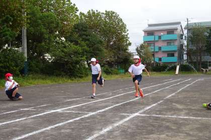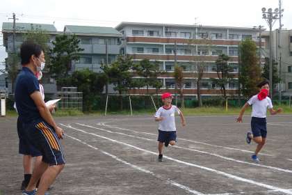 5年体育「短距離走」の様子です。本時は、100mのタイムを計測しました。
