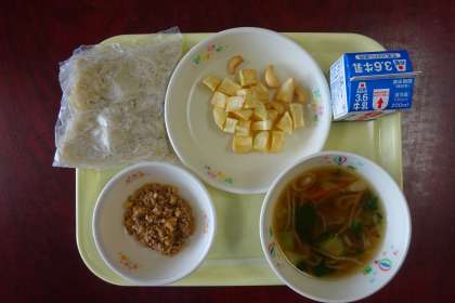 本日の献立は、「担々麺(肉味噌・スープ) 中華麺 ポテトとナッツのから揚げ 牛乳」でした。