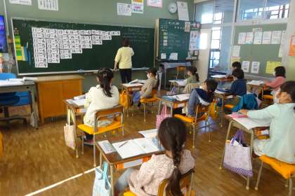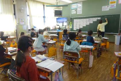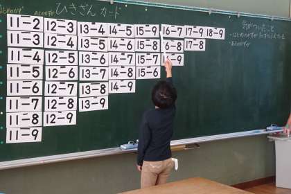 1年算数「ひきざん」の様子です。答えが順に少なくなるひきざんカードが黒板に並べられました。この様子から気がついたことを発表していました。