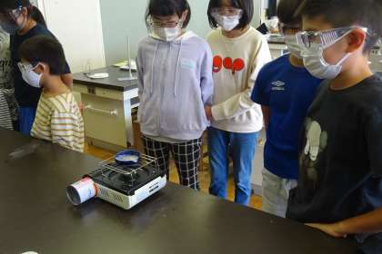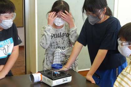 その後、取り出せなかった食塩を蒸発皿に入れて熱して取り出す実験を行いました。飛び散るであろう食塩に備えて、ゴーグルをかけ、距離を取り、安全に気をつけて様子を観察しました。