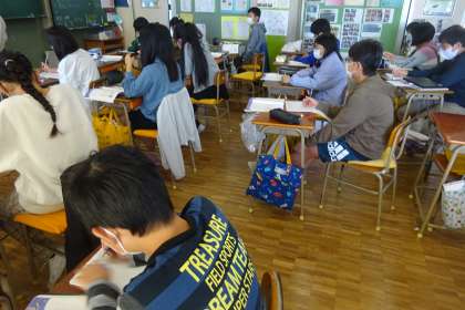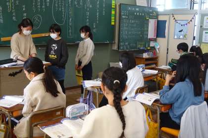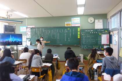 6年国語「連詩を発見する」の様子です。詩の共同制作する「連詩」を作っていきます。最終的にはグループの仲間とつくるのですが、本日はその練習として、教科書の例の詩につなげて詩を考えることになりました。各自、どんな詩をつなげていこうか考えていました。できた児童は、先生に見せてアドバイスを受けていました。