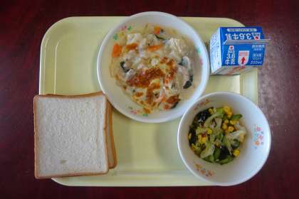 本日の献立は、「チキンポテトグラタン 海藻サラダ 角型食パン 牛乳」でした。