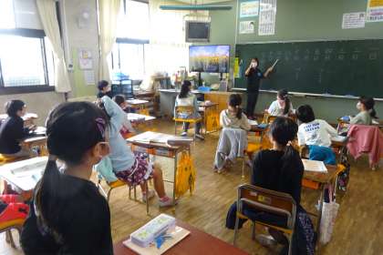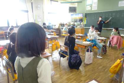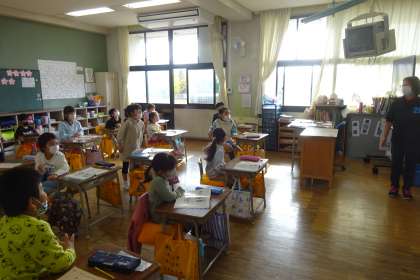 1年国語「ことばのいずみ」の様子です。日付と曜日の読み方を学習します。写真は、日付の読み方を練習している様子です。ゲーム形式で進められ、とても盛り上がっていました。