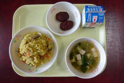 本日の献立は、「きのことウィンナーのカレーピラフ 肉団子のケチャップ和え 野菜スープ 牛乳」でした。