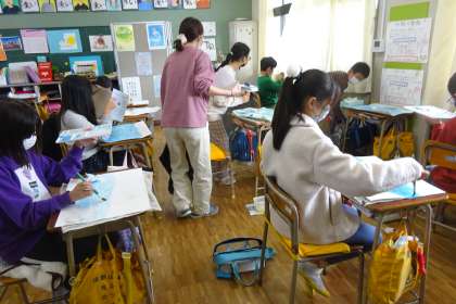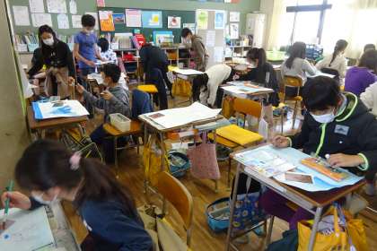 6年図工「物語の絵」の様子です。宮沢賢治の短編童話「やまなし」を読んで、絵に表しています。かにの兄弟の甲羅の色や水の中の様子を表すために、色の混色、水の濃淡に気をつけ、丁寧に作業を進めていました。どの子も水の中の透明感を出すように頑張っていました。