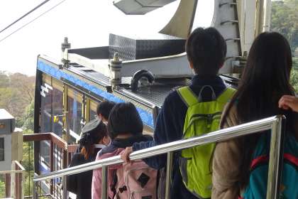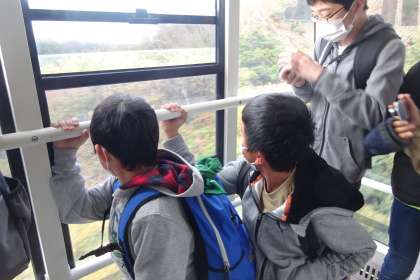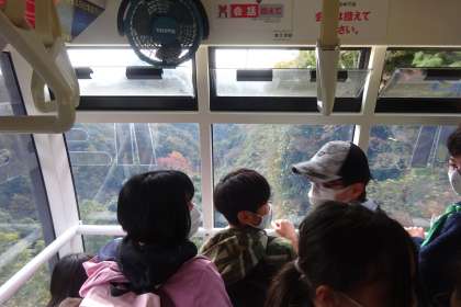 最初の目的地は、久能山東照宮です、東照宮へは、行き帰り日本平ロープウェーを使いました。ロープウェーのゴンドラは、あおい号とたちばな号があり、青いあおい号に乗っていきました。高いところが苦手の子たちは、手すりをしっかりと握って外の様子を見ていました。