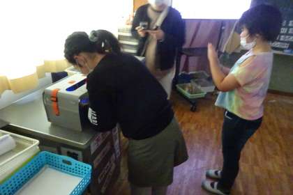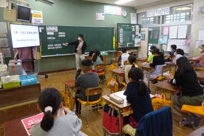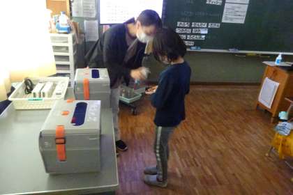 3年保健「けんこうな生活」の様子です。本日は、養護教諭による効果的な手の洗い方についての授業が行われました。本日の課題は、「毎日の生活で、手洗いなど体を清潔につることはなぜ必要か」です。普段の手洗いについて大丈夫なのか、実験をしてみました。まずは、手に蛍光剤をつけて、ブラックライトに当ててみました。