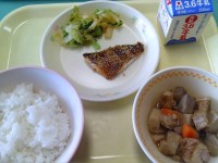 本日の献立は、「ししゃも竜田揚げ かぼちゃのそぼろ煮 けんちん汁 委託米飯 牛乳」でした。