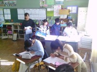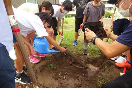 5年理科「流れる水のはたらきと土地の変化」の様子です。グラウンドに山、そして川をつくり、流水実験をしました。流れによって土が削れるところ、土が積み重なるところがないか、観察しました。
