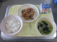 本日の献立は、「さわらの味噌焼き からし和え えび団子のすまし汁 自校米飯 牛乳」でした。